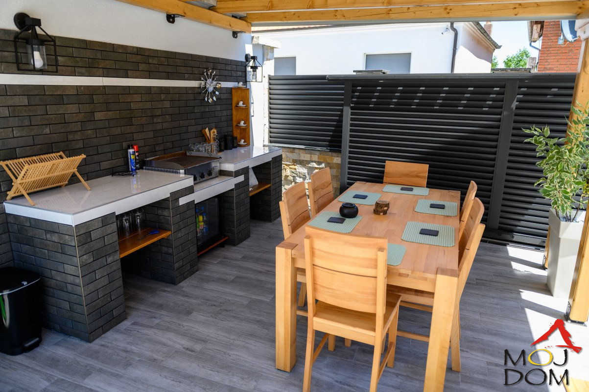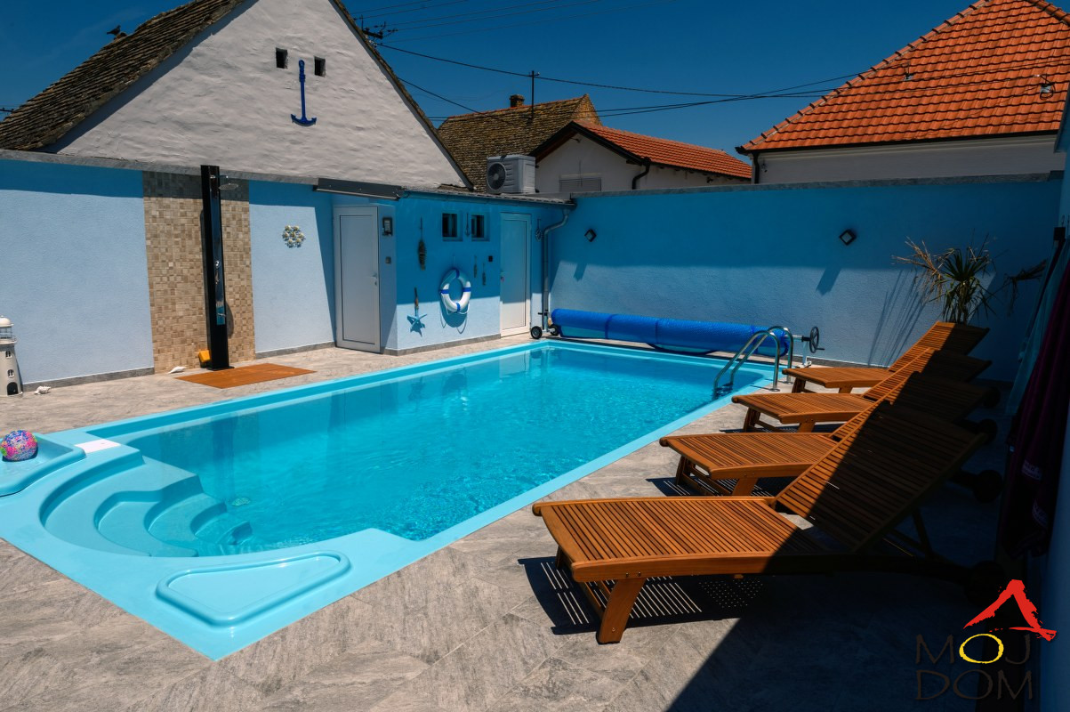 The landscaped courtyard features a contemporary swimming pool measuring 4 × 8 meters with heating and saltwater technology, equipped with all accompanying technical systems. Next to the pool are two pavilions – one intended for rest and relaxation, the other designed as a barbecue and dining area suitable for family or tourist gatherings. The entire interior is furnished with custom-made, handcrafted furniture that gives the property a distinctive character and added value.