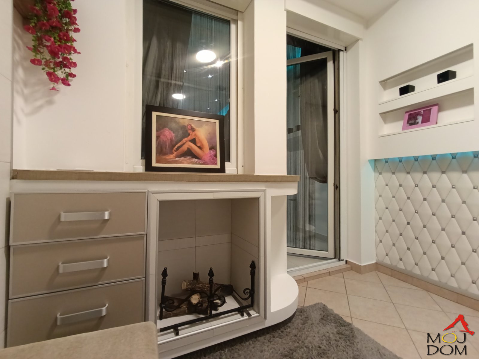 Prostran i svetao dnevni boravak, potpuno opremljen (TV, kablovska televizija, dve klima jedinice), sa izlazom na komfornu terasu koja poseduje dekorativni kamin (imitacija)