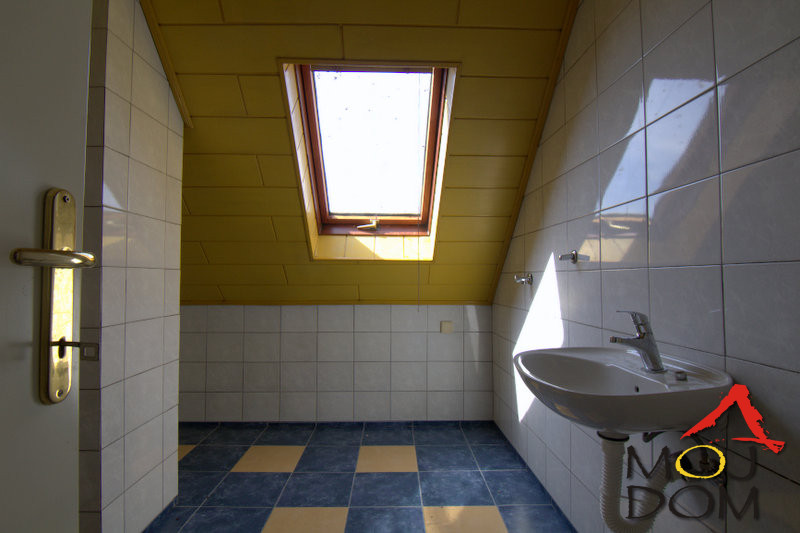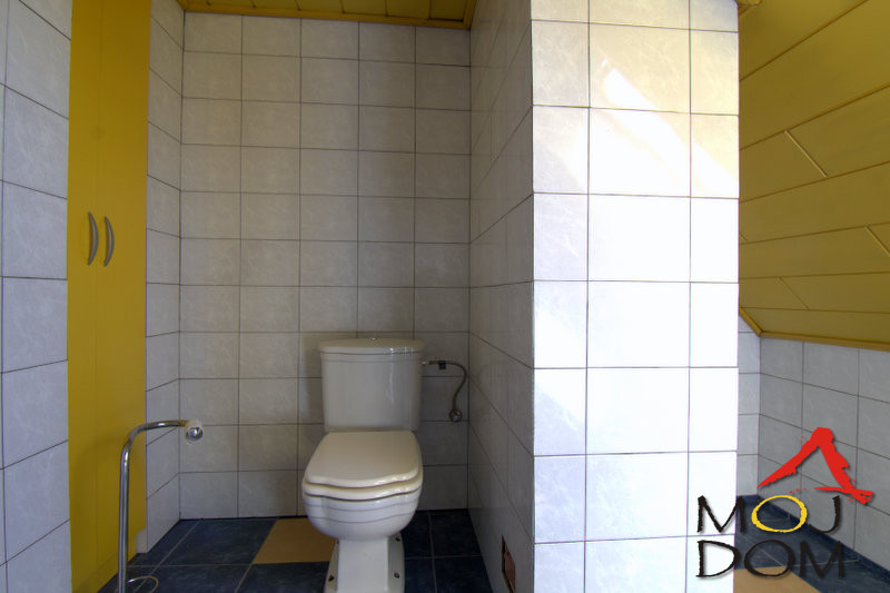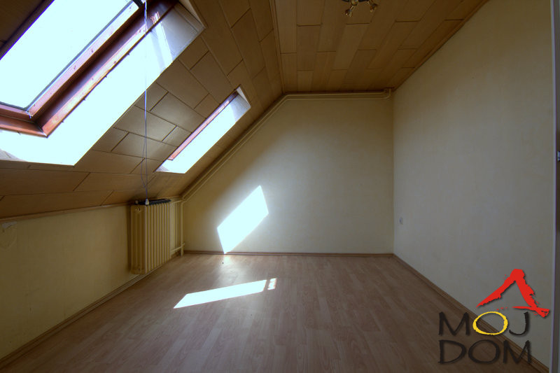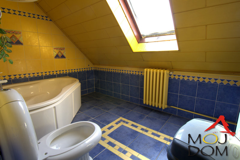 The lower level includes a large and bright living room connected to the dining area, a separate kitchen, and a comfortable bedroom with its own spacious bathroom. The upper level features three rooms, additional bathrooms, and charming architectural details such as sloped ceilings and roof windows.